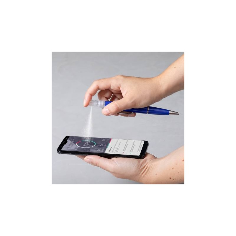 Caneta anti-bacteriana com pulverizador recarregável integrado e tampa protetora que inclui ponteiro. Este item com tratamento anti-bacteriano é capaz de reduzir drasticamente as cargas bacterianas presentes nas superfícies dos materiais, graças à incorporação de agentes microbianos permanentes estáticos, com alta efetividade para inibir e prevenir a contaminação bacteriana.